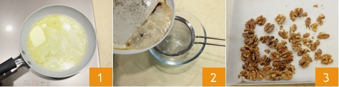Para preparar los financiers con nueces y mermelada de melocotón, derrite la mantequilla a fuego lento en una sartén grande 1, removiendo con una cuchara de madera hasta que se vuelva oscura: así obtendrás la mantequilla noisette, es decir, una mantequilla derretida de color avellana dorada para que adquiera un aroma muy particular. Filtra la mantequilla noisette en un cuenco con la ayuda de un colador de malla fina 2 y deja que se enfríe. Tuesta las nueces a 180° durante 3-4 minutos en una bandeja forrada con papel de horno 3;
