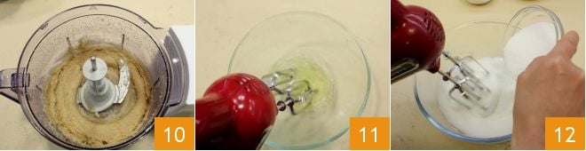 Activa el procesador para crear una mezcla homogénea 10 y luego transfiere la masa que has obtenido a un bol. En un recipiente separa las yemas de las claras, montando estas últimas junto con la pizca de sal 11: cuando la mezcla se vuelva blanca y espumosa, puedes añadir la dosis restante de azúcar 12.