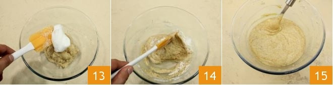 Vierte una pequeña cantidad de claras montadas a punto de nieve 13 y mezcla con una espátula para suavizar la mezcla; luego añade las claras restantes mezclando de abajo hacia arriba para evitar que se desmonten 14, hasta que la mezcla sea suave y homogénea 15.