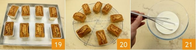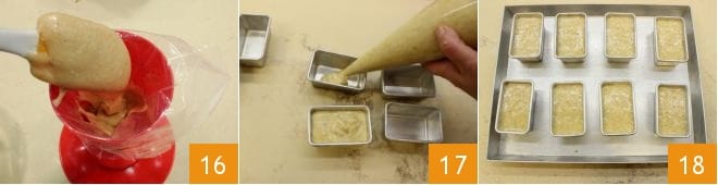 Coloca la masa que has obtenido en una manga pastelera sin boquilla a la que puedes hacerle un orificio 16. Unta con mantequilla 8 moldes rectangulares de tamaño 8x5,5x4 cm y luego llénalos hasta ¾ con aproximadamente 95 g de masa 17. Una vez terminado 18, hornea los financiers en horno estático precalentado a 170° durante 25 minutos (o 150° durante 15 minutos si es en horno de convección).