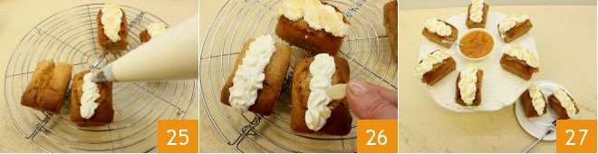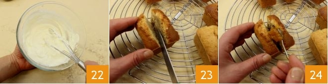 Una vez lista 22, colócala en una manga pastelera con boquilla estrellada. Transcurrido el tiempo necesario, puedes rellenar los financiers: haz un pequeño corte vertical por el lado largo sin llegar al fondo, después abre los pastelitos con cuidado 23; con una cucharita rellena el interior con la mermelada de melocotón 24 (también puedes ayudarte con una manga pastelera sin boquilla a la que puedes hacerle un orificio).