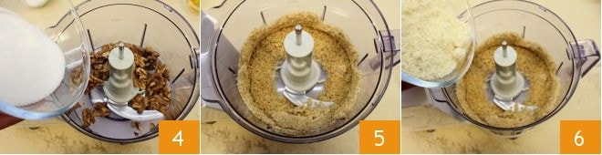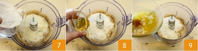 en un procesador de alimentos coloca las nueces tostadas y la mitad de la dosis de azúcar 4, que servirá para absorber el aceite liberado por las nueces durante la molienda. Activa las cuchillas de forma intermitente (para evitar que las nueces se recalienten) hasta obtener una harina 5. Añade al procesador la harina de almendra 6,