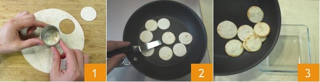 Para preparar los finger food de pepinos y hummus, primero sacad 16 discos de las tortitas utilizando un cortador de 5 cm de diámetro 1. Calentad bien una plancha y tostád los discos durante 2 minutos por un lado y 1 minuto por el otro 2, luego dejadlos a un lado 3.