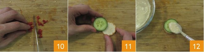Finalmente picad finamente el chile fresco, después de quitarle las semillas 10. Estás listos para ensamblar los finger food: colocad una rodaja de pepino sobre cada disco de tortita 11, luego agregad una cucharadita de hummus 12.