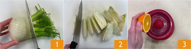 Para preparar los hinojos estofados sobre crema de cannellini, primero lava los hinojos y elimina las extremidades, asegurándote de conservar las ramitas de hinojo para la decoración 1. Corta los hinojos en gajos 2 y reserva. Exprime el jugo de las naranjas 3.