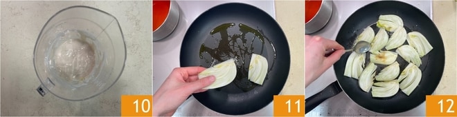 Debes obtener una crema suave y homogénea 10. Calienta un poco de aceite en una sartén, coloca aquí los hinojos 11 y dóralos en la sartén por ambos lados a fuego medio-alto durante unos 5 minutos 12.