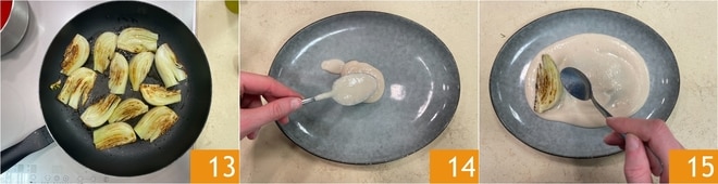 Los hinojos deben resultar bien dorados 13. Todo está listo para componer el plato: distribuye en el fondo la crema de frijoles 14, luego coloca encima los hinojos 15.