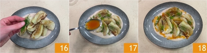 Adorna con las ramitas de hinojo reservadas 16, sazona con la reducción de salsa de naranja 17 y sirve inmediatamente tus hinojos estofados sobre crema de cannellini 18!