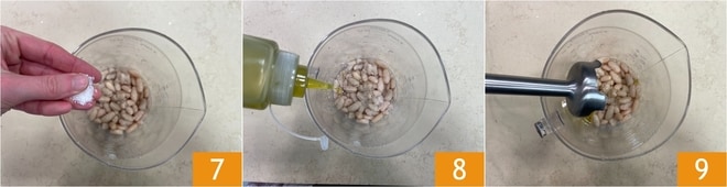 En un recipiente, coloca los frijoles cannellini escurridos y enjuagados, luego sazona con sal 7, pimienta y un chorrito de aceite de oliva virgen extra 8, añade 100 g de agua y tritura con una batidora de inmersión 9.