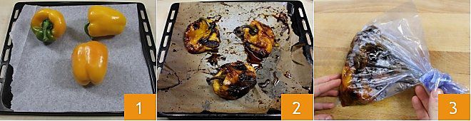 Para preparar la falsa carbonara, comenzad tomando los pimientos amarillos y, después de lavarlos cuidadosamente, ponedlos en una bandeja de horno colocándolos sobre papel de horno 1. Hornead los pimientos a 250 grados en horno estático durante 40-45 minutos (en horno ventilado a 230 grados durante unos 35 minutos) 2. Una vez cocidos, poned los pimientos en una bolsa y dejadlos enfriar durante unos diez minutos, este procedimiento facilitará el desprendimiento de la piel y os permitirá pelarlos con mayor facilidad 3.