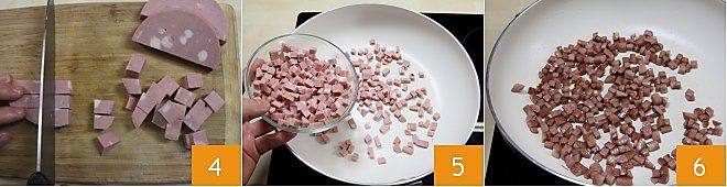 Mientras los pimientos se enfrían, tomad la mortadela y cortadla en cubos 4. Una vez hecho esto, poned a dorar los cubos de mortadela en una sartén grande antiadherente, sin añadir aceite, 5 hasta que estén dorados 6.