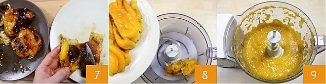 Tomad los pimientos y limpiadlos: quitad el tallo, la piel y las semillas ayudándoos con un cuchillo 7. Una vez limpios, poned los pimientos en la batidora 8 y trituradlos hasta obtener una crema homogénea 9.