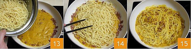 Cuando los espaguetis estén al dente, escurridlos cuidando de dejar 1-2 cucharones de agua de cocción aparte 13. Saltead los espaguetis junto con la salsa de pimientos y mortadela directamente en la sartén, alargando con 1-2 cucharones de agua de cocción y cocinando a fuego bajo durante un par de minutos para amalgamar todo 14. ¡Añadid un chorrito de aceite de oliva virgen extra y vuestra falsa carbonara está lista! 15