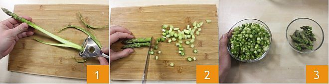 Para preparar el flan de espárragos, comienza limpiando los espárragos (para más indicaciones consulta la Escuela de Cocina: cómo limpiar los espárragos, que encuentras Cómo limpiar los espárragos) 1: pela el tallo con un pelador o delicadamente con un cuchillito, procediendo verticalmente de arriba hacia abajo, hasta que el tallo quede blanco, eliminando la parte verde fibrosa. Corta el tallo en rodajas 2 y reserva las puntas aparte 3.