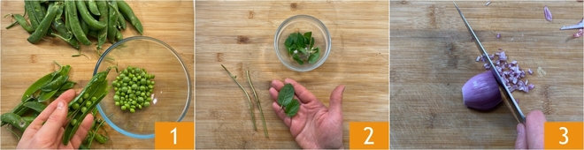 Para preparar el flan de guisantes, primero desgranad las vainas 1 y obtendréis aproximadamente 350 g de guisantes pelados. Separad los tallos de la menta y reservadlos 2. Limpiad y picad la chalota 3.