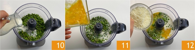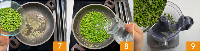 Verted los guisantes 7, añadid un poco de agua 8 y dejad cocer unos veinte minutos. Escurridlos, dejad que se enfríen antes de ponerlos en la batidora 9.
