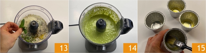 Condimentad con las hojas de menta 13, sal y pimienta, luego batid la mezcla 14. Pincelad con aceite el interior de 6 moldes con capacidad de 100 g 15.