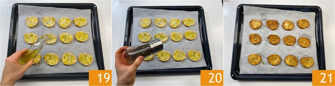 Sazonad con aceite 19, sal y pimienta 20 y tostarlos en el horno precalentado a 200° durante 5-10 minutos 21, hasta que estén dorados.