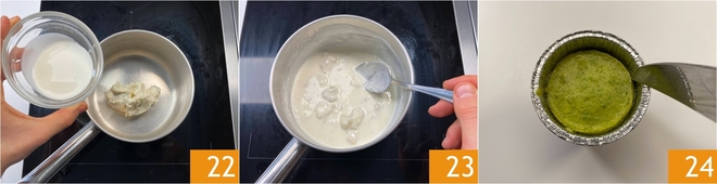 Finalmente, preparad la fondue cuando queden 5 minutos para el final de la cocción de los flanes. Poned el Gorgonzola en trozos en un cazo con la nata 22 y dejad que se derrita suavemente 23. Sacad los flanes del horno y antes de desmoldarlos, pasad un cuchillo por el borde para sacarlos más fácilmente 24.