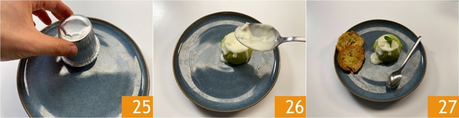 Volcad los moldes en un plato de servir 25, adornad con la fondue 26 y las tostadas de pan. Los flanes de guisantes están listos 27.