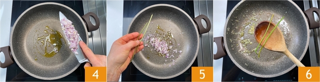 En una cacerola, verted un poco de aceite, la chalota 1 y los tallos de menta 2. Sofreíd durante unos minutos y luego retirad los tallos 6.