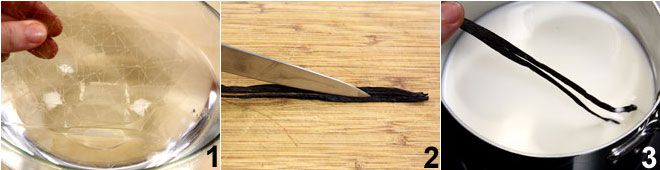 Para preparar el flan de vainilla comienza poniendo las hojas de gelatina a remojar en un bol con agua fría durante 15 minutos 1. Abre la vaina de vainilla por la mitad 2 y extrae las semillas ayudándote siempre con el cuchillo; en un cazo, vierte la leche y la nata y añade la vaina de vainilla y las semillas; pon la cacerola al fuego y lleva lentamente los ingredientes a rozar la ebullición 3.
