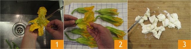 Para preparar las flores de calabacín rellenas de burrata y tomates secos, comienza por lavar las flores delicadamente bajo agua corriente 1. Sécalas siempre delicadamente con un paño. Cuando estén secas, quita las protuberancias manteniendo la copa inferior, abre delicadamente la flor para identificar el pistilo interno. Luego extrae el pistilo con las manos de cada flor 2. Corta la burrata en rodajas 3.
