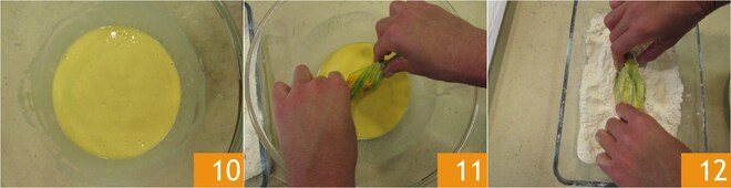 Debes obtener una masa lisa 10. En una olla grande calienta el aceite hasta llevarlo a 170-180°, mientras que en un bol pon suficiente harina para enharinar las flores. Luego sumérgelas una a una en la masa 11, escúrrelas del exceso de masa y pásalas por la harina 12.