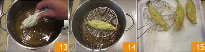 Sumerge las flores en el aceite caliente 13 y fríe una a una las flores de calabacín durante unos minutos hasta que estén doradas y crujientes; luego escúrrelas con una espumadera cuando estén doradas 14. Transfiérelas a una bandeja cubierta con papel absorbente 15, sal al gusto y sírvelas muy calientes!