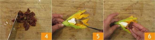 Escurre los tomates y sécalos con papel de cocina para eliminar el exceso de aceite, luego córtalos en trocitos 4. Comienza a rellenar tus flores de calabacín: ábrelas con delicadeza e inserta una rodaja de burrata 5 y los tomates 6.