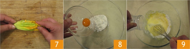 Luego toma delicadamente las hojas con los dedos para cerrar las flores. Haz una ligera torsión de las hojas envolviéndolas sobre sí mismas 7 para que el relleno no se salga y reserva tus flores de calabacín rellenas. Mientras tanto, prepara la masa: en un bol añade la harina y la yema 8. Luego vierte también el agua con gas helada y mezcla con una varilla para evitar que se formen grumos 9.