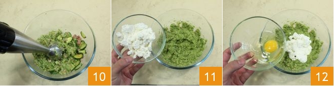 traslada todo a un bol alto, tritura con la batidora de mano 10 el tiempo necesario para obtener una mezcla cremosa y homogénea, luego añade la ricotta 11, el huevo 12