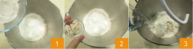 Para realizar la focaccia con alcaparras, romero y aceitunas taggiasche, verted la harina 00 y la harina Manitoba en el bol de una amasadora equipada con gancho para amasar 1, añadid la levadura fresca desmenuzada 2 y verted la mitad del agua a temperatura ambiente indicada en la receta 3.