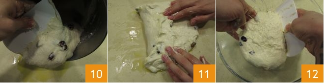 viértela aquí ayudándote con una rasqueta 10, la masa parecerá bastante hidratada. Ahora da algunos pliegues a la masa recogiendo los bordes hacia el interior 11, dándole una forma esférica; luego colócala dentro de un bol 12.