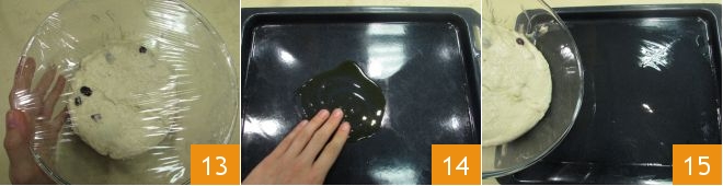 Cubre con film 13 y deja que la masa suba durante una hora en el horno apagado con la luz encendida. Pasado este tiempo, engrasa una bandeja de horno con el aceite de oliva (tomado de la cantidad para condimentar) 14, y luego vierte la masa sobre la bandeja 15