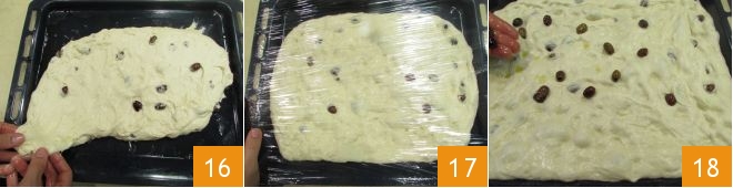 y extiéndela con la punta de los dedos para distribuirla uniformemente en la bandeja 16. Cubre la bandeja con film transparente 17 y deja que suba otra hora en el horno apagado con la luz encendida. Pasado el tiempo de la segunda subida, rellena la focaccia con las aceitunas taggiasche escurridas 18
