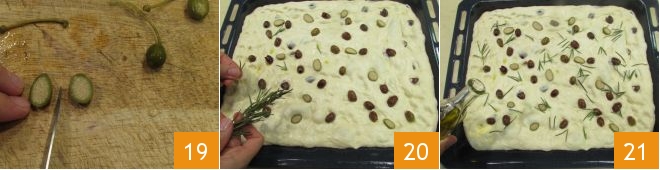 Corta por la mitad los frutos de la alcaparra 19 y distribúyelos también sobre la superficie de la focaccia, aromatiza con las agujas de romero 20 y condimenta con el aceite de oliva restante 21.