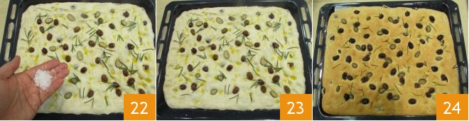 Para terminar, distribuye también los copos de sal por encima 22. La focaccia está lista para ser horneada 23: hornéala en horno estático precalentado a 200° durante 30-35 minutos, cuidando de poner dentro del horno un cazo lleno de agua caliente que garantizará el nivel adecuado de humedad durante la cocción. Pasado el tiempo de cocción, saca la focaccia con alcaparras, romero y aceitunas taggiasche del horno 24, déjala templar y luego ¡sírvela!