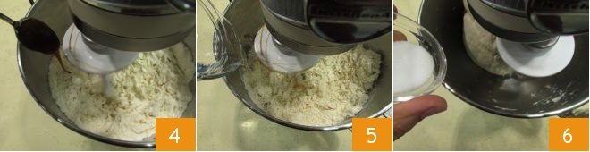 Pon en marcha la amasadora a baja velocidad y añade también la malta (como alternativa puedes utilizar una cucharadita de azúcar). Añade en hilo también el agua restante 5, la sal 6