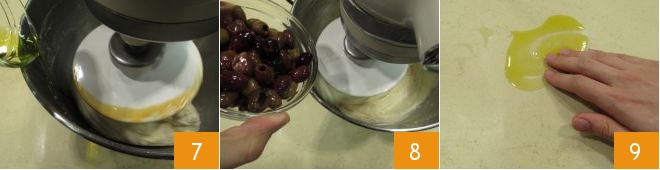 y luego también el aceite de oliva poco a poco 7, amasa durante 10-15 minutos hasta que la masa se haya enganchado al gancho, en ese momento añade también la mitad de las aceitunas taggiasche escurridas de su aceite de conservación 8 y mezcla durante 10 segundos con la amasadora, el tiempo necesario para que las aceitunas se incorporen. Apaga la amasadora, engrasa con poco aceite una superficie de trabajo 9,