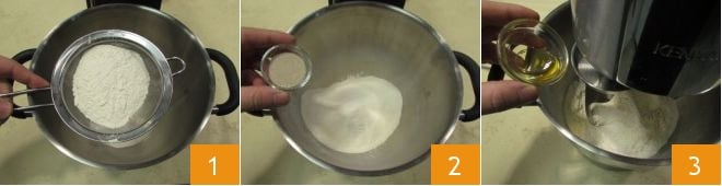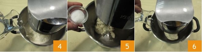 En este punto, añade aproximadamente 3/4 del agua, vertiéndola poco a poco 4. Una vez que la mezcla haya tomado forma, añade la sal 5 y agrega también el agua restante, siempre lentamente 6.