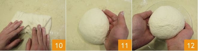 Continúa haciendo pliegues en la masa, cogiendo los extremos y doblándolos hacia adentro 10. Después, forma una bola 11 y ponla en un bol previamente aceitado 12. Luego, deja que suba durante un par de horas cubriendo el bol con film transparente.
