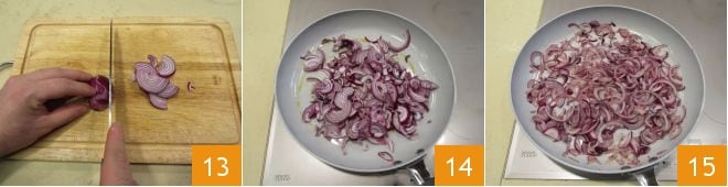 Mientras tanto, corta las cebollas en rodajas 13 y saltéalas con un poco de aceite 14 durante unos diez minutos, salándolas y añadiendo pimienta 15.