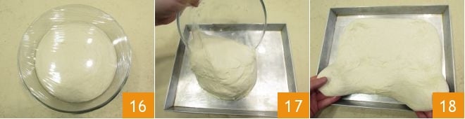 Pasadas las dos horas de fermentación, la masa habrá duplicado su volumen 16. En este punto, engrasa una bandeja de 35X28 cm y vierte la masa en ella 17; procede a extenderla con las manos muy suavemente 18.