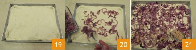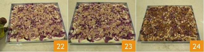 Una vez cubierta toda la superficie de la bandeja 19, espolvorea la focaccia con las cebollas recién salteadas en la sartén 20 y finalmente añade también el atún 21.