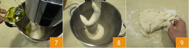Cuando la masa haya absorbido toda el agua, añade el aceite en hilo poco a poco (como hiciste con el agua) para permitir que la masa lo absorba gradualmente, favoreciendo así el desarrollo de la red de gluten 7. Trabaja la mezcla en la amasadora durante unos 15 minutos 8, luego pásala a una superficie espolvoreada con harina 9.