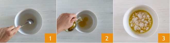 Para preparar la focaccia con patatas fácil y rápida, comienza con la masa: disuelve la levadura en un bol con el agua 1, luego vierte el aceite 2 y mezcla. Finalmente, añade la harina y sigue mezclando 3.