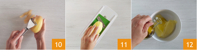 Mientras tanto pela las patatas 10 y córtalas en rodajas finas con la ayuda de una mandolina o un cuchillo 11. Pon las rodajas en un bol y adereza con 15 g de aceite de oliva virgen extra 12.