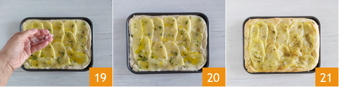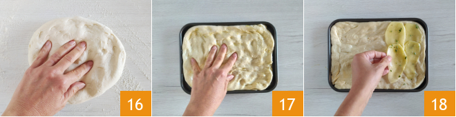 Después del tiempo de fermentación, trabaja rápidamente la masa en la superficie de trabajo enharinada presionándola con la punta de los dedos 16. Transfiérela a una bandeja de 25 x 20 cm engrasada y extiéndela hasta un grosor de aproximadamente medio centímetro, ayudándote con 5 g de aceite de oliva virgen extra vertido en la superficie 17. En este punto, distribuye las rodajas de patata en la superficie, superponiéndolas ligeramente 18.