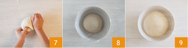 Trabaja un poco más hasta obtener una masa homogénea 7. Transfiere la bola a un bol, cúbrela con film 8 y deja reposar durante 45 minutos, o hasta que doble su volumen, bajo una manta de lana 9.